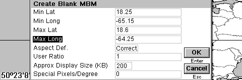 Step 4 : Run RealMaps and select 'Create' from the file menu. Enter the geographic range. Normally you should leave the Aspect Def set to 'Correct'. Put in an approximate desired display size - note that the created map usually takes far less memory on disk than it does to display. Tap 'OK'