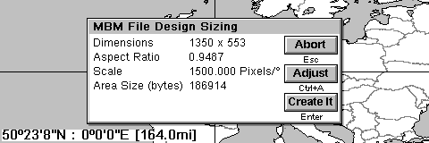 By the way, I've deliberately broken one of my own rules here to illustrate a FAQ - this map is a very big jump from World2.MBM (8 pixels/degree). There are very few points on World2.MBM that fall inside this bounded area, so if you were actually going to use this map, it would be a good idea to create an intermediate one - otherwise zooming in could be very tricky !.
