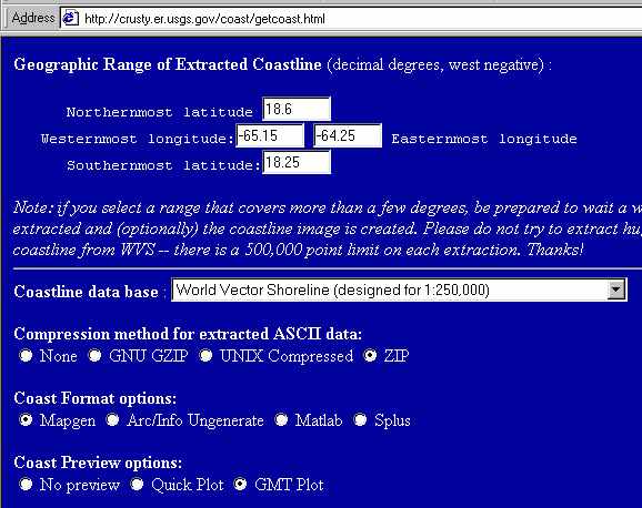 Step 1 : Go to the Coastline Extractor web site and enter the geographic range of interest. Make sure that the MapGen format is selected and decide whether you want the data zipped or not. It's always a good idea to enable at least a 'Quick Plot' to ensure that you've got the right area.